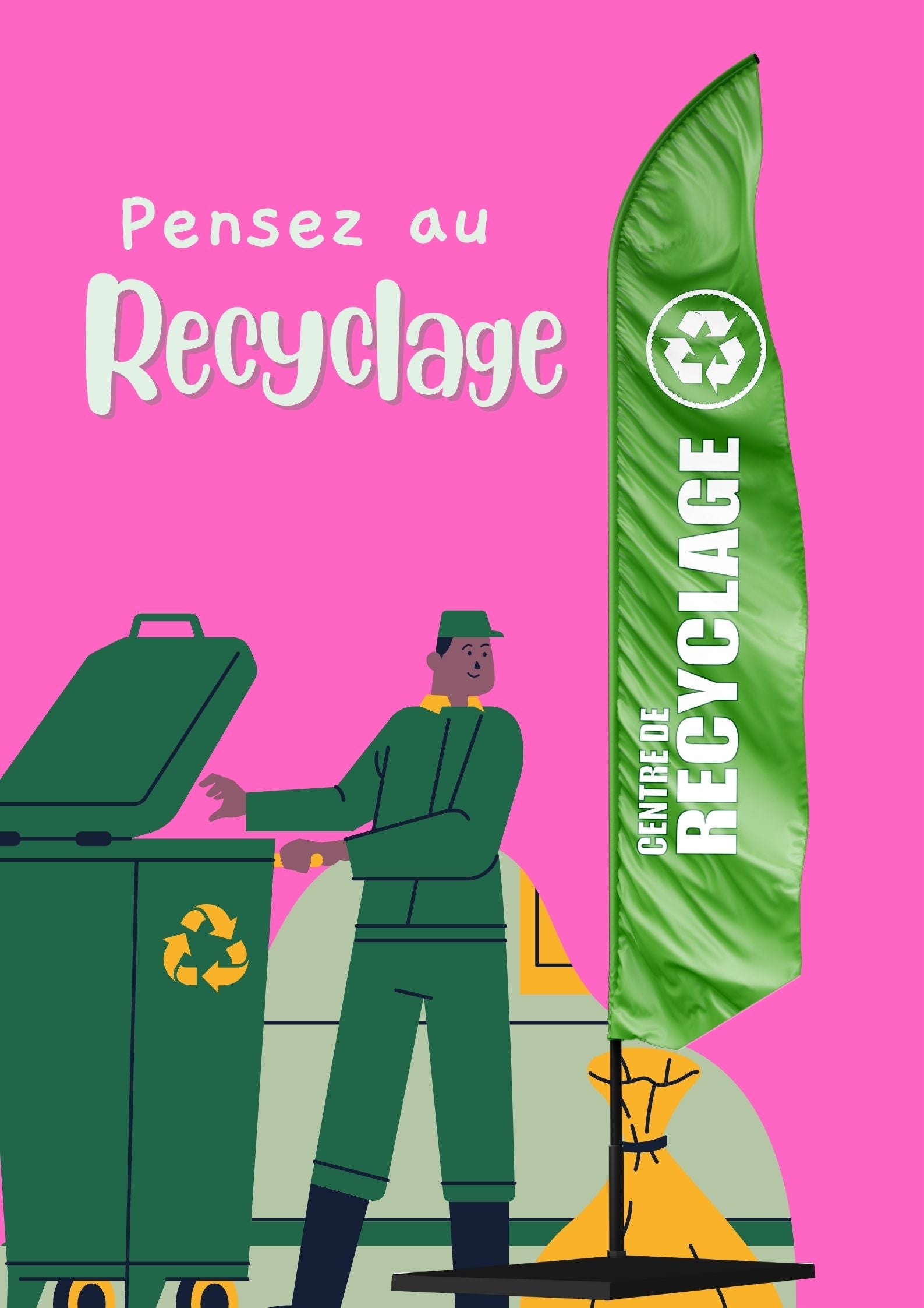 Drapeau signalétique CENTRE DE RECYCLAGE + LOGO forme aile + mat + socle